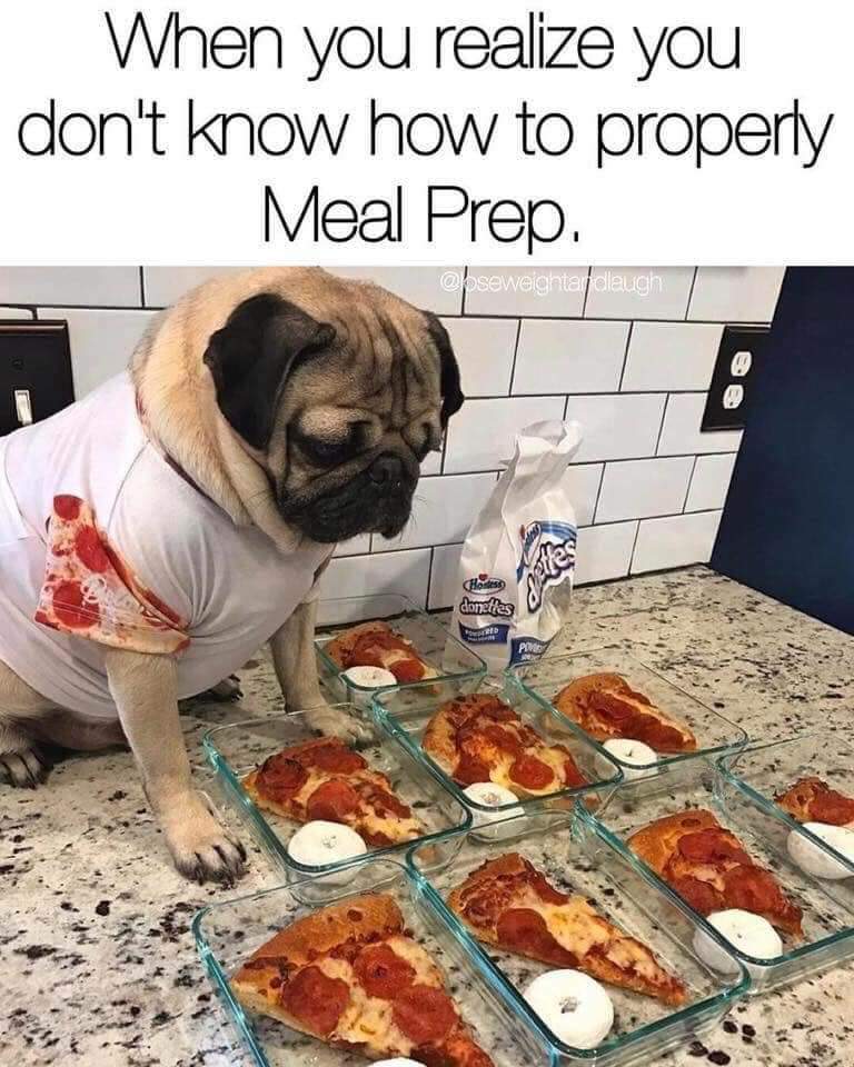 Meal Prep. Those are two words that I would guess you hear and see a lot of these days. What do they mean to you? Does it mean you have a weeks worth of lunches and/or snacks planned out and ready to go? Does it mean that you know exactly what you are having for dinner each night this week? I came across the below picture the other day, it’s a meme I’ve seen several times. It’s cute, it has a Pug after all; and pizza and donuts. For some reason when I saw it this time it made me start thinking about it’s meaning. The caption reads, “When you realize you don’t know how to properly meal prep.” The pug looks sad as he looks down on his prepped containers of pizza and donuts. Sad I assume because his meal prep is done but isn’t healthy.