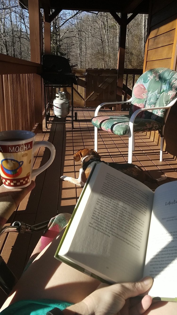 Since this blog is new I’m sure most if not all of my readers are friends, who live within an hour of me. That means you all got to also enjoy the beautiful weather we had here today. I hate that I slept most of the day, not waking up until 3pm, but no way can I function without sleep. Fortunately though it was still nice outside so I got to enjoy my coffee out on my large porch, along with my sidekick Roscoe, and a great book.